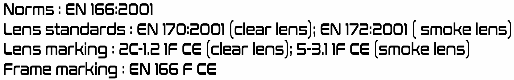 | Lens Standard: UV Norm - EN 170:2001 (clear lens); EN 172:2001 (smoke lens) |