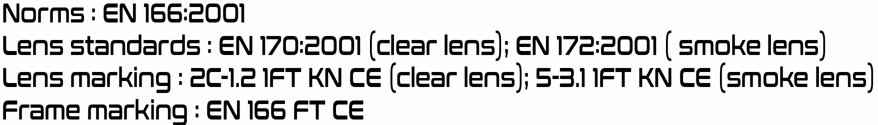 Lens Standard: UV Norm - EN 170:2001 (clear lens); EN 172:2001 (smoke lens)